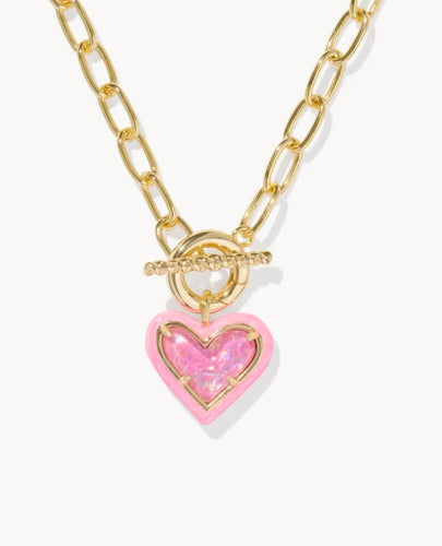 Ari Heart Gold Enamel Frame Link and Chain Necklace in Pink Iridescent Glitter Glass