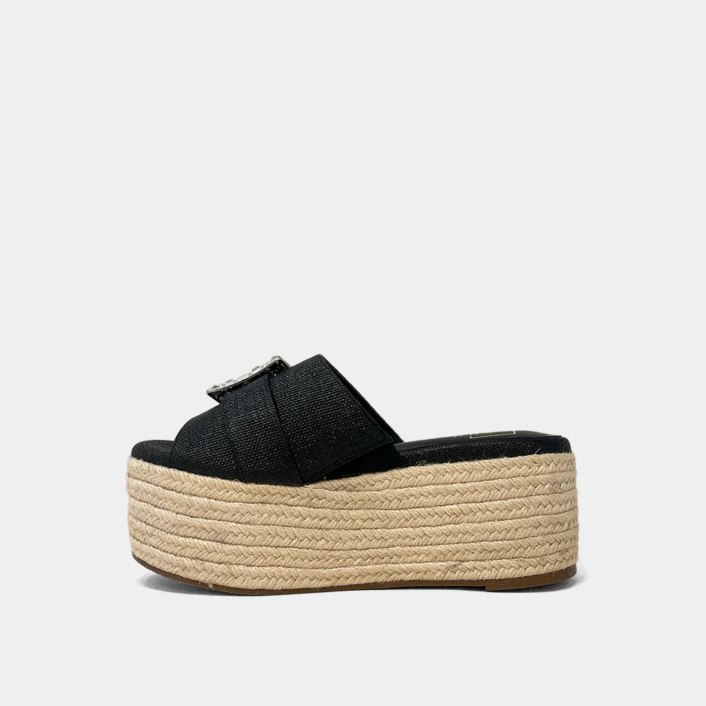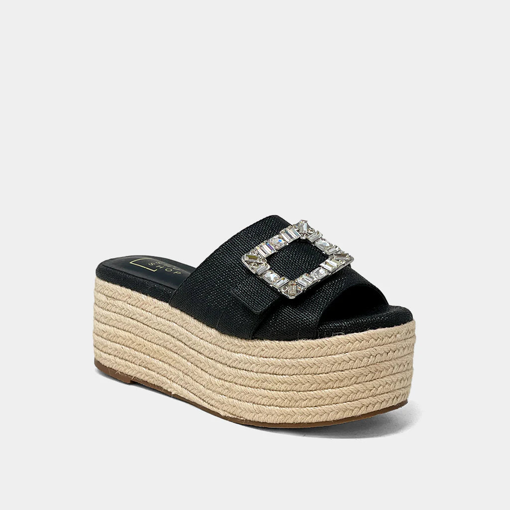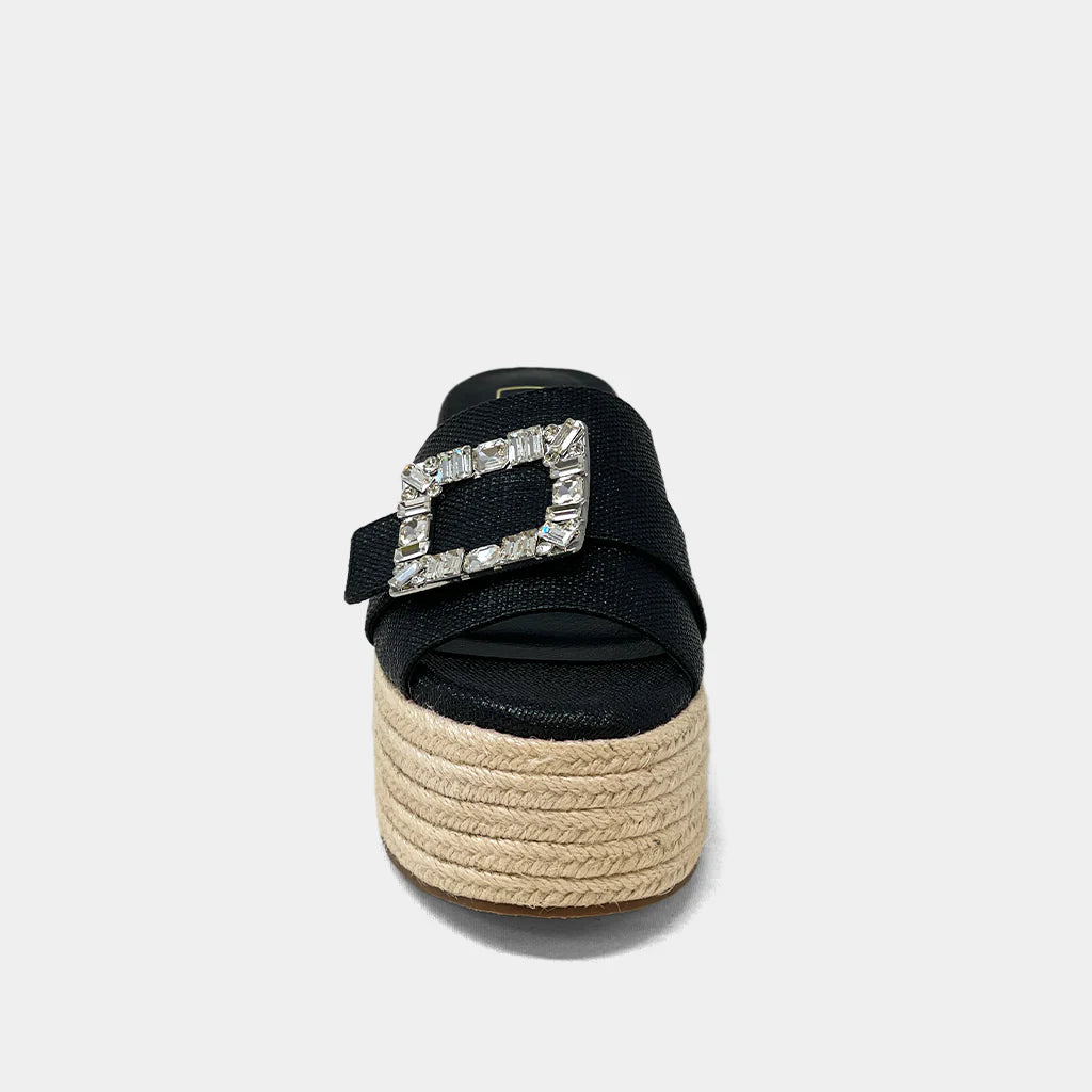 Classic meets statement-making with the KELLY in Black. Its woven-textured upper and dazzling crystal-embellished buckle give a bold, luxe feel, while the jute-wrapped platform-wedge hybrid delivers effortless height with a laid-back touch. Perfectly balancing comfort and glam, these sandals will take you from daytime chic to evening elegance in a heartbeat.