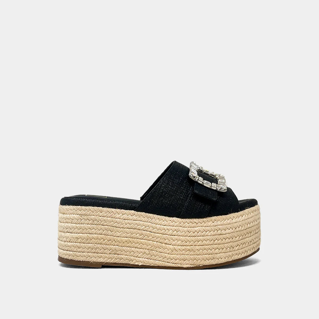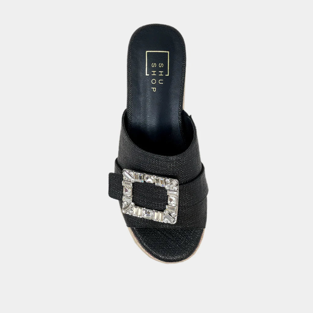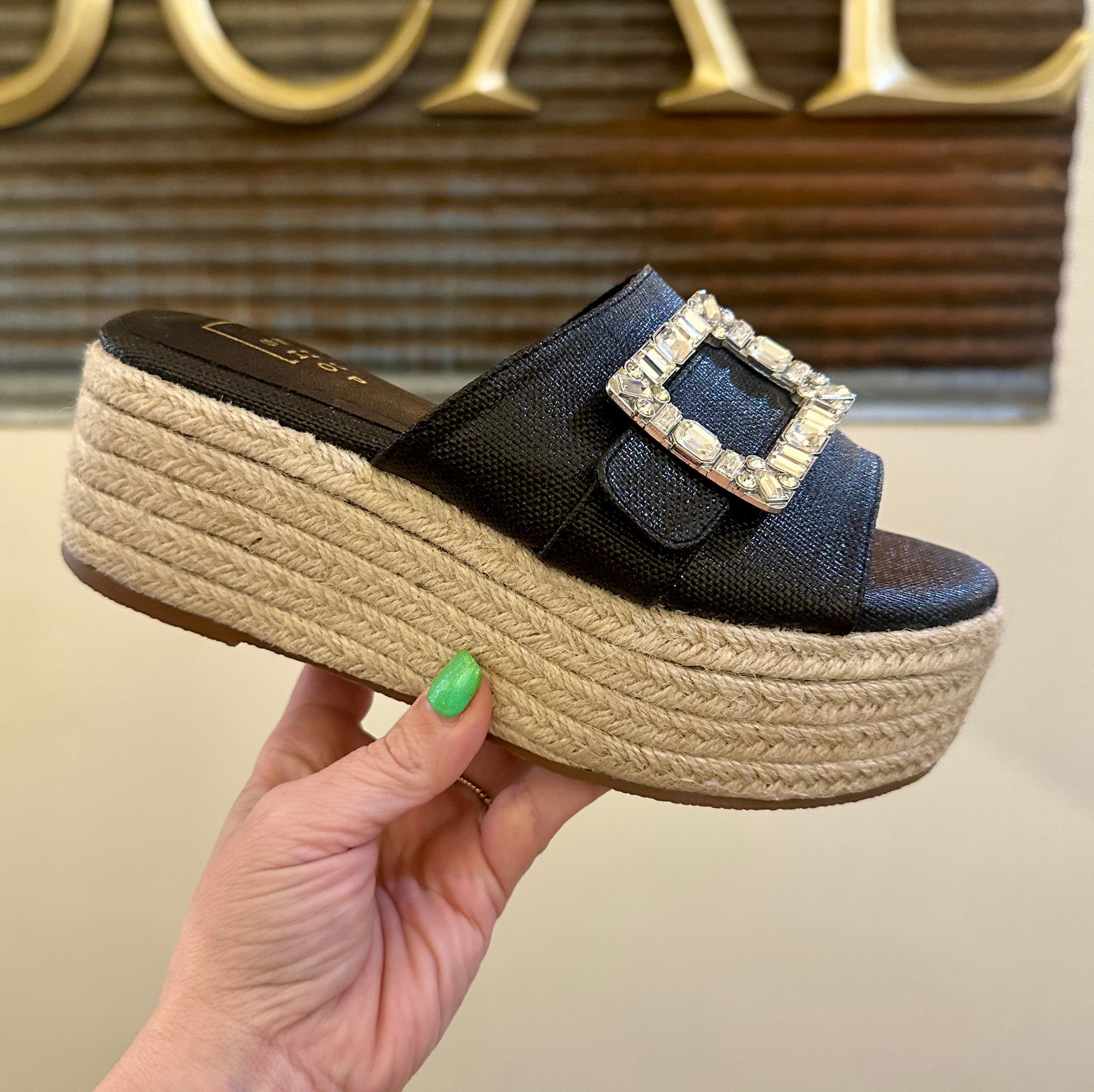 Classic meets statement-making with the KELLY in Black. Its woven-textured upper and dazzling crystal-embellished buckle give a bold, luxe feel, while the jute-wrapped platform-wedge hybrid delivers effortless height with a laid-back touch. Perfectly balancing comfort and glam, these sandals will take you from daytime chic to evening elegance in a heartbeat.
