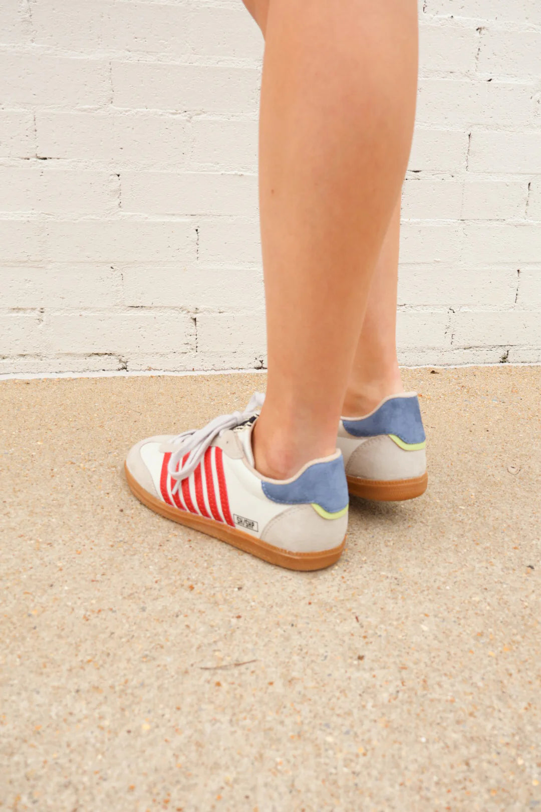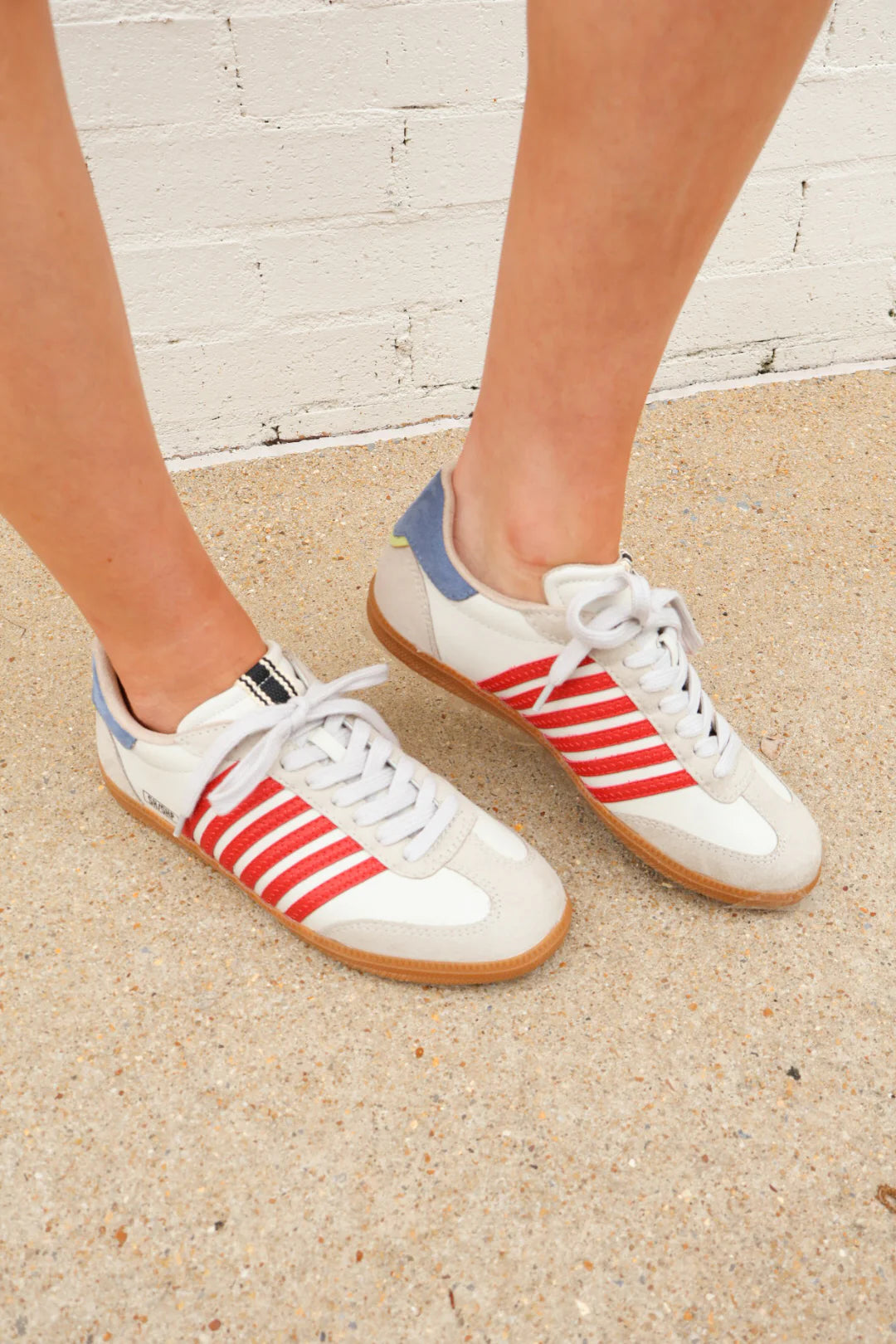 Say hello to your new go-to sneaker for all things red, white, and cute. The Shu Shop Stevie Sneaker blends vintage vibes with a pop of all-American charm thanks to its bold red side stripes, creamy suede accents, and contrasting navy blue heel tab. These are the kind of sneakers that instantly elevate your casual look without sacrificing comfort (because yes, they’re that comfy).