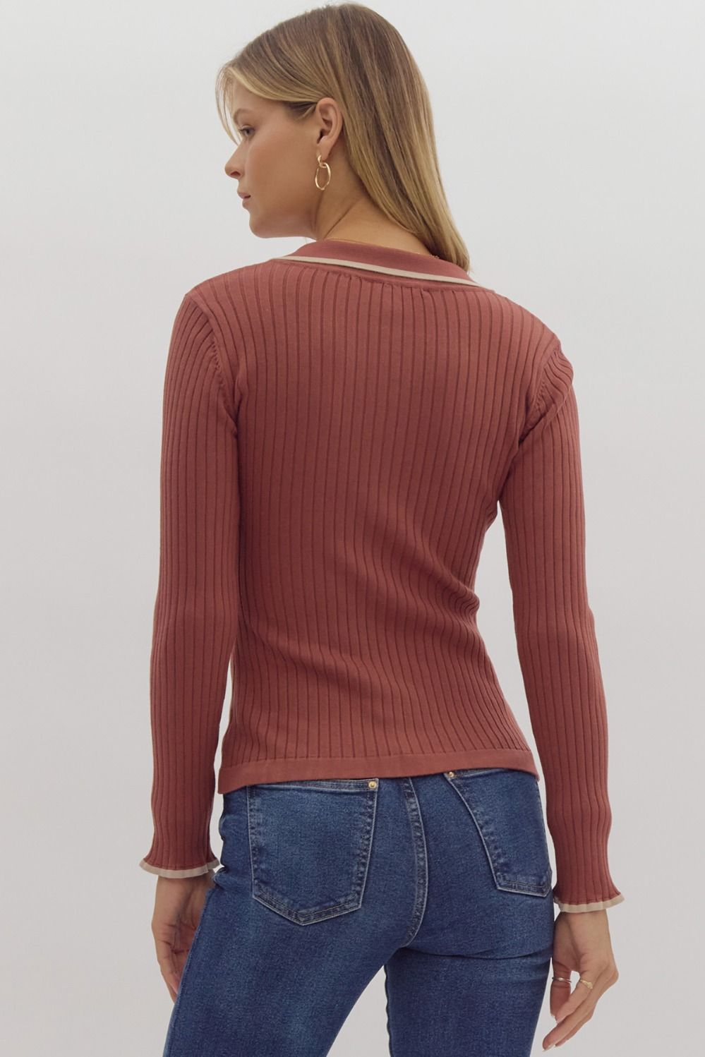 Solid ribbed long sleeve collared knit top featuring button up detail at bust. Contrasting solid trim detail. Unlined. Knit. Non-sheer. Lightweight