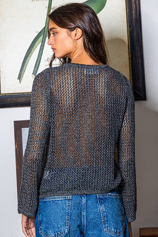Crewneck Crochet Knit Fishnet Top - Long sleeves - Sexy and cut top - Full see through - Imported
