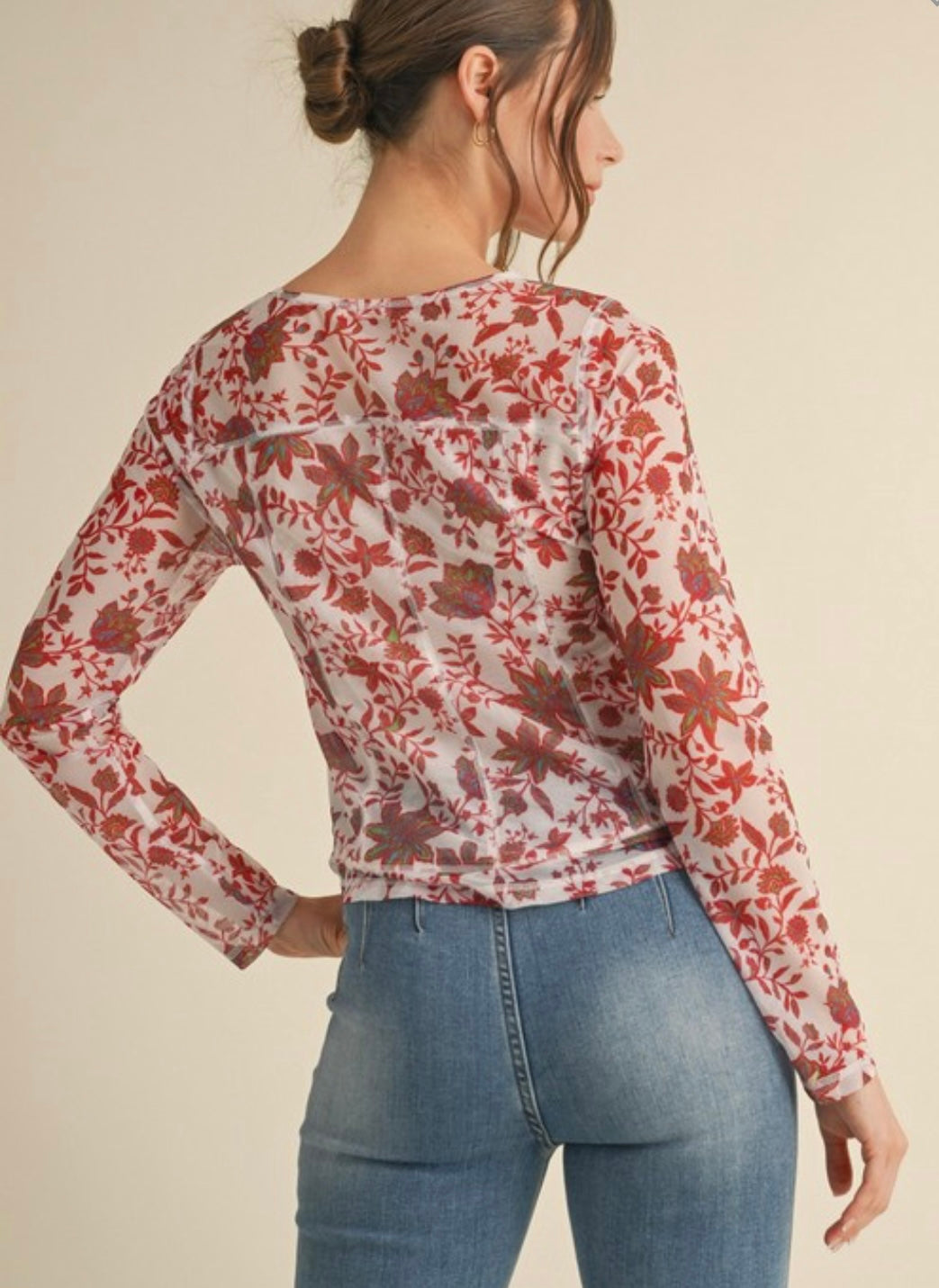 Fallen leaves print mesh top framed by sheer long sleeves and cut to a curve-skimming fit, and stitch seams edge.