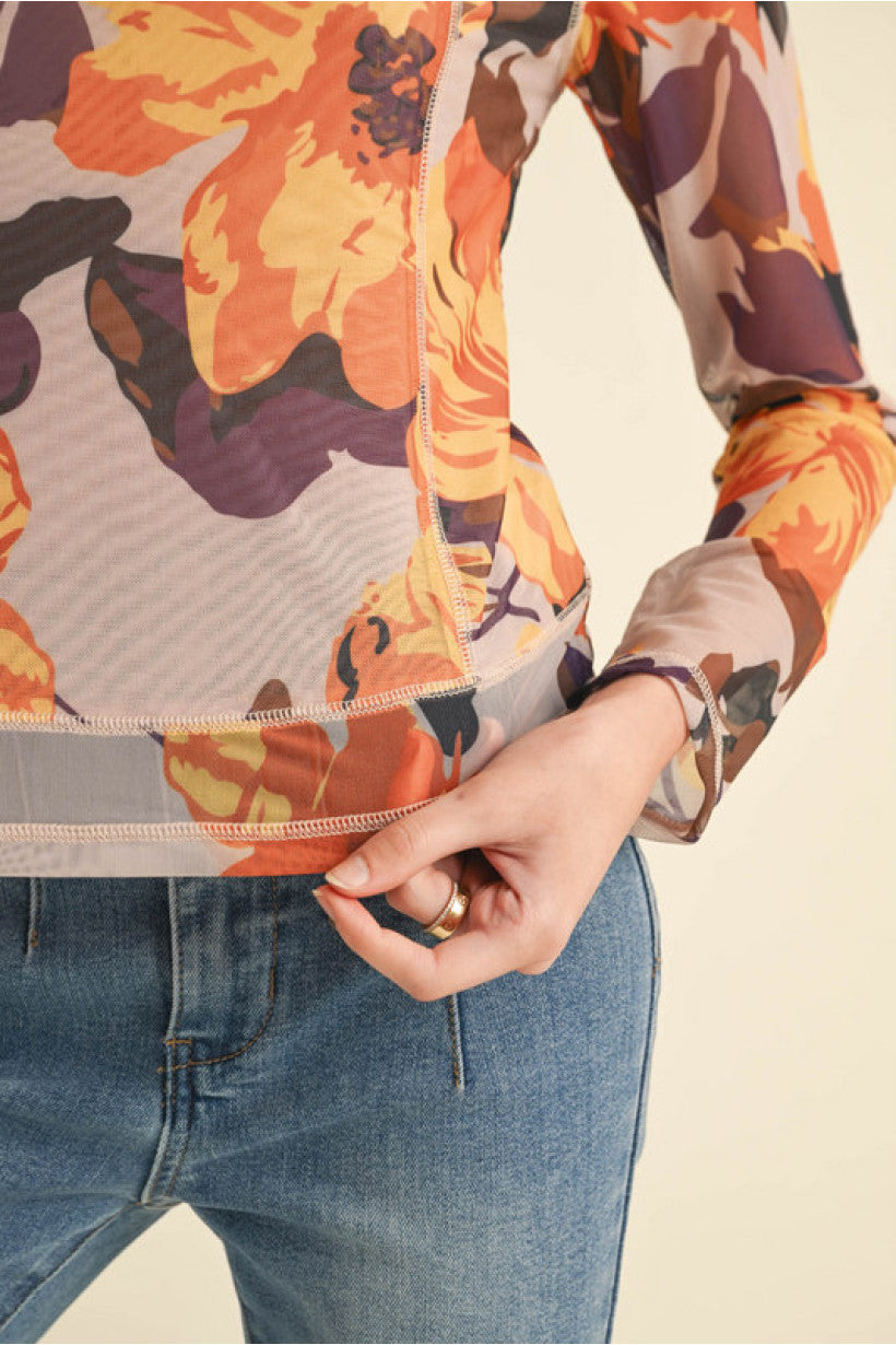 Floral print mesh top framed by sheer long sleeves and cut to a curve-skimming fit, and stitch seams edge.