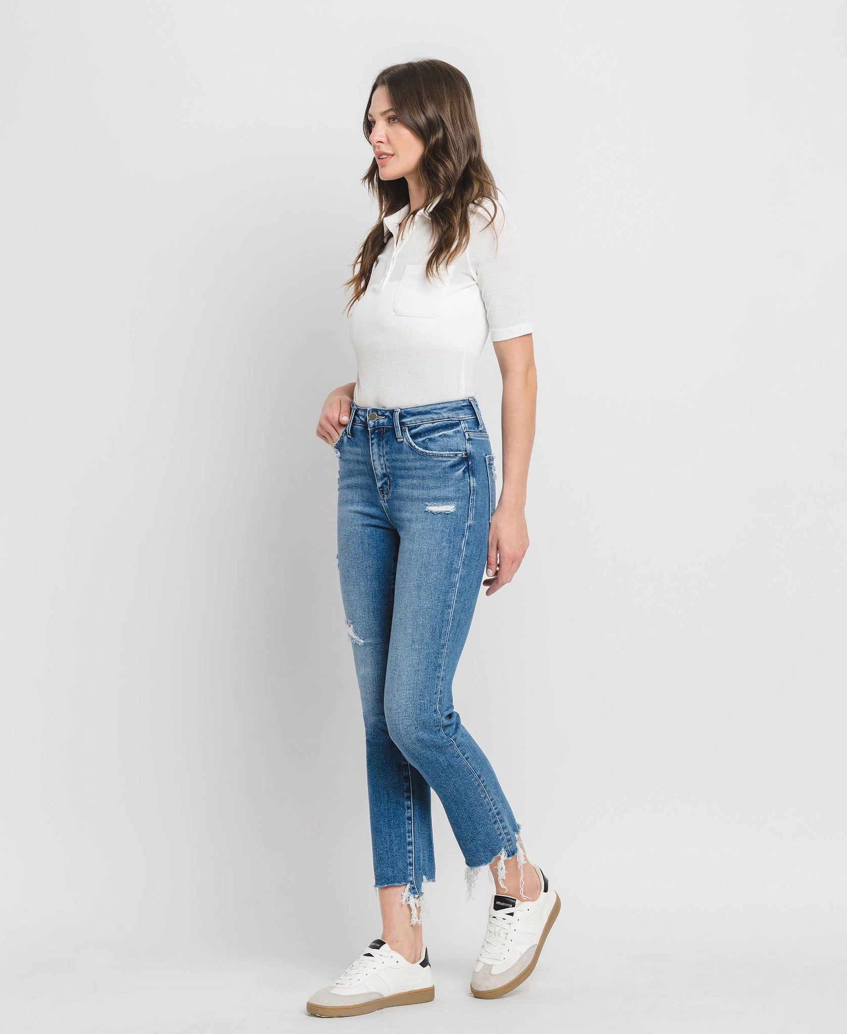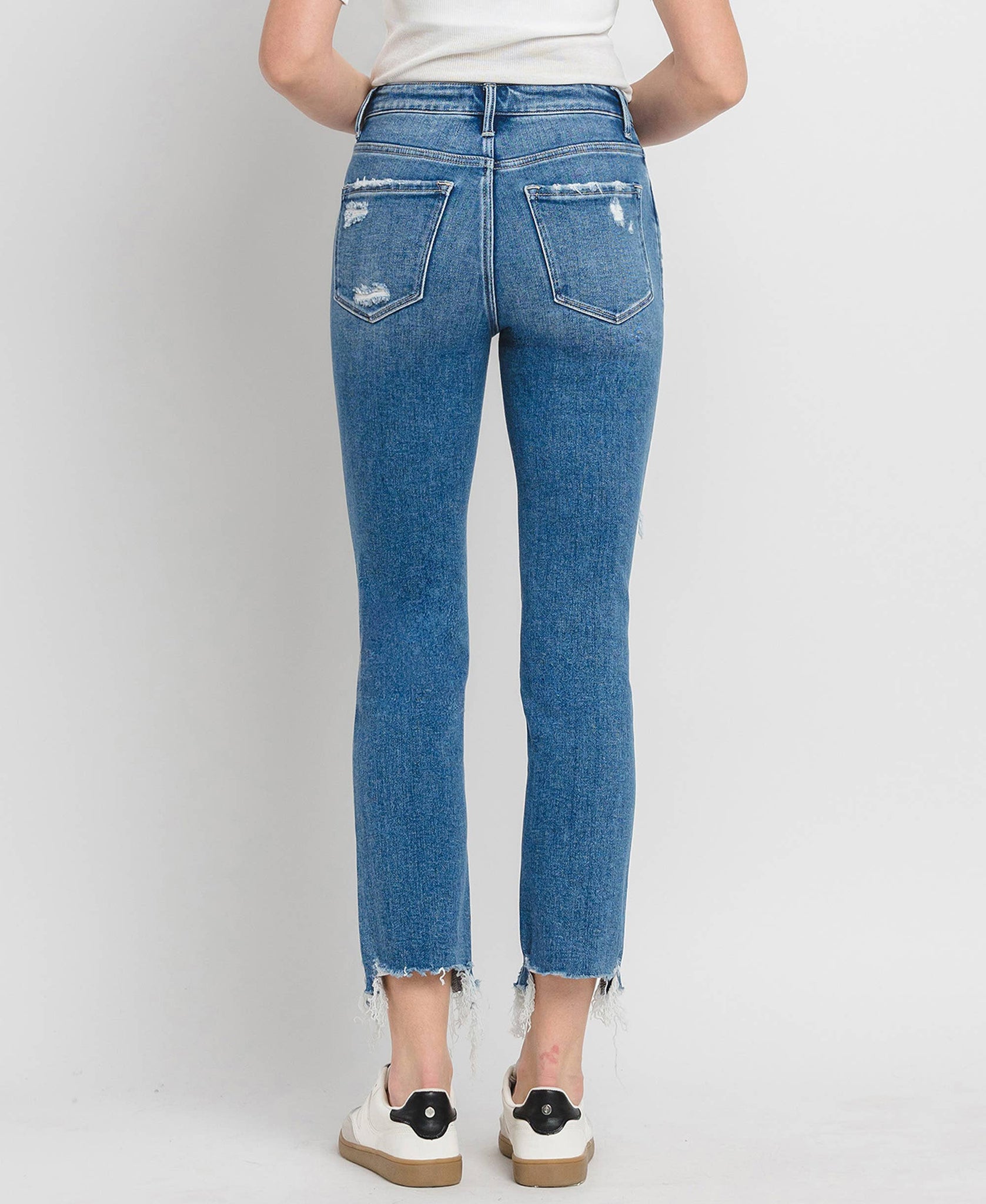 HIGH RISE SLIM STRAIGHT JEANS COMFORT STRETCH DENIM, HIGH RISE WAIST, DISTRESSED DETAIL, ANKLE LENGTH, SLIM STRAIGHT JEANS F. RISE: 10" / INSEAM: 27 1/2" / LEG OPENING: 14 1/2" MODEL IS 5'9" WEARING SIZE 26