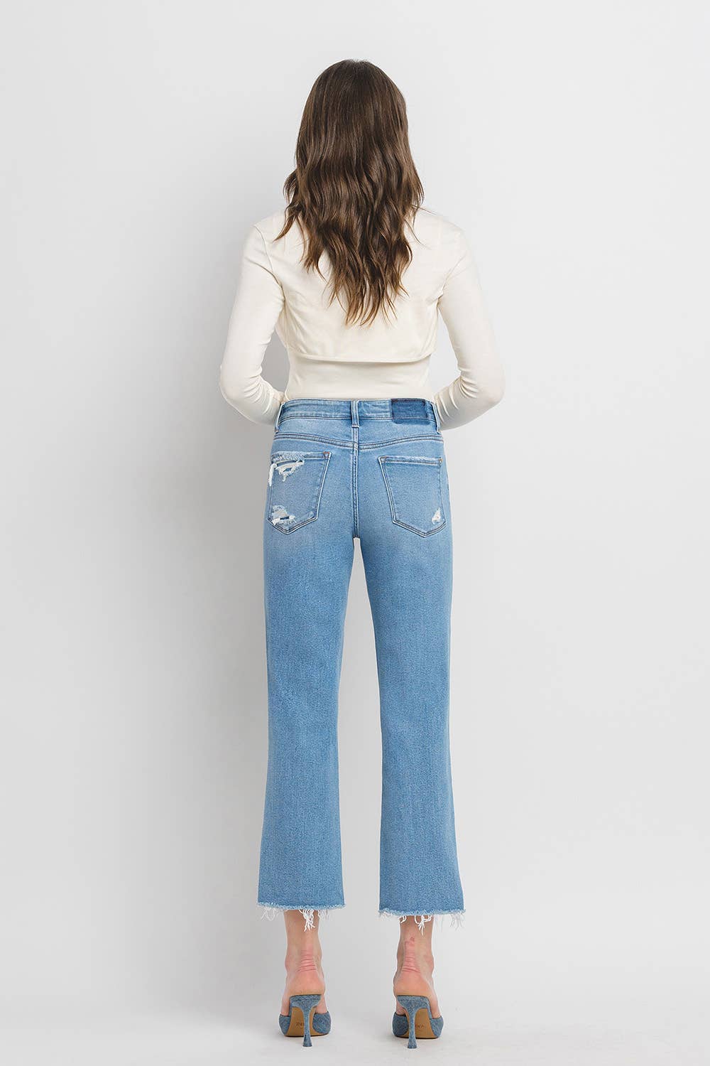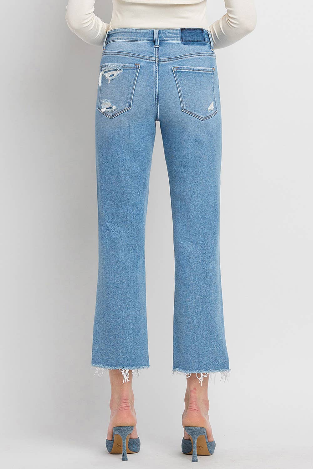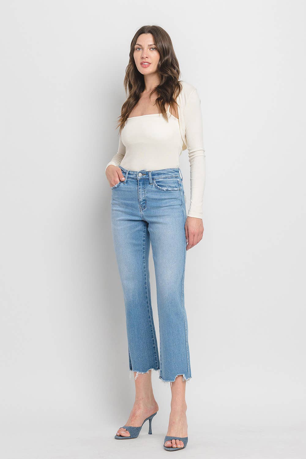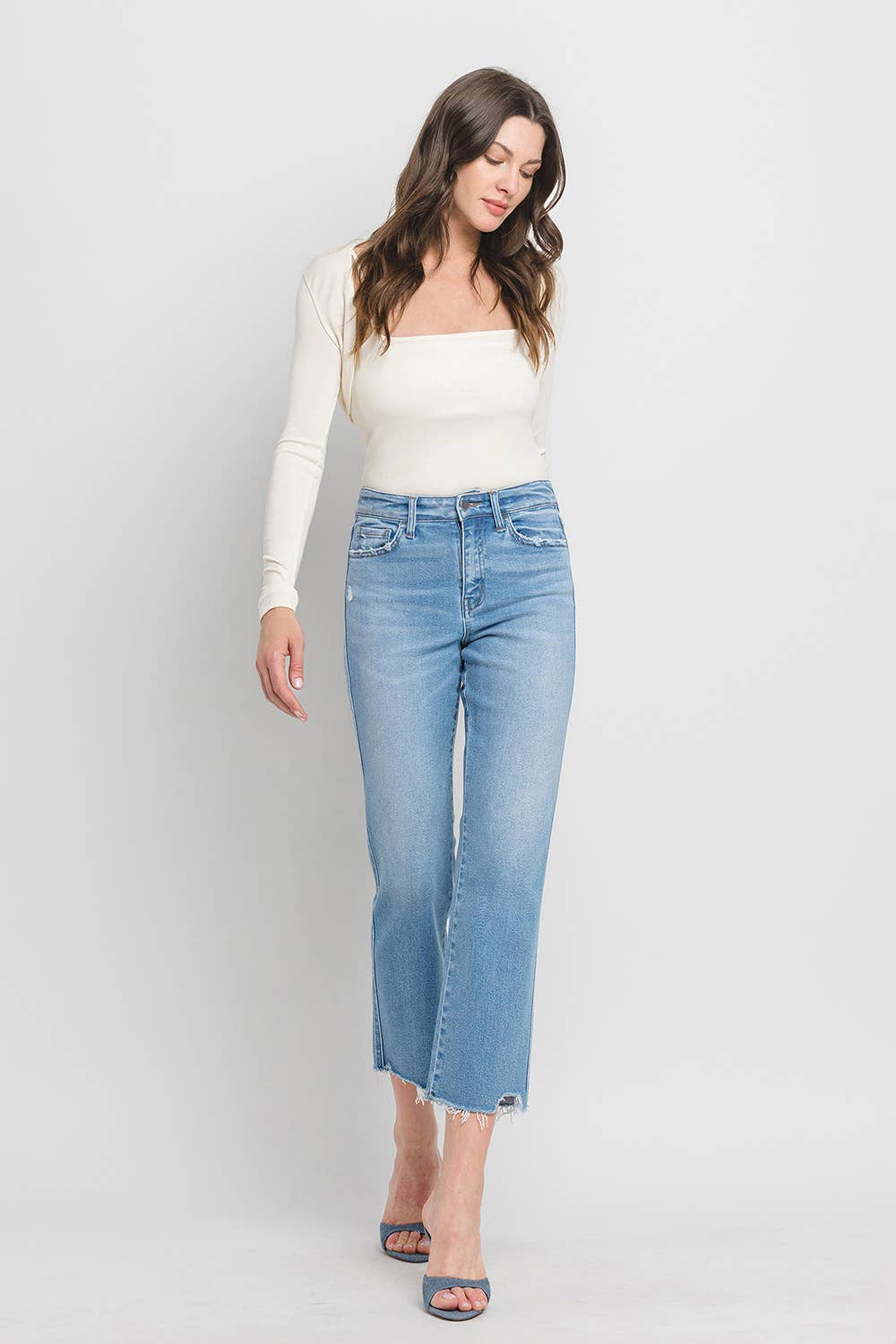 HIGH RISE CROP SLIM STRAIGHT JEANS COMFORT STRETCH DENIM, HIGH RISE WAIST, DISTRESSED DETAIL, CROPPED LENGTH, RAW HEM, STRAIGHT JEANS F. RISE: 10" / INSEAM: 16'' / LEG OPENING: 27'' MODEL IS 5' 10'' WEARING SIZE 26
