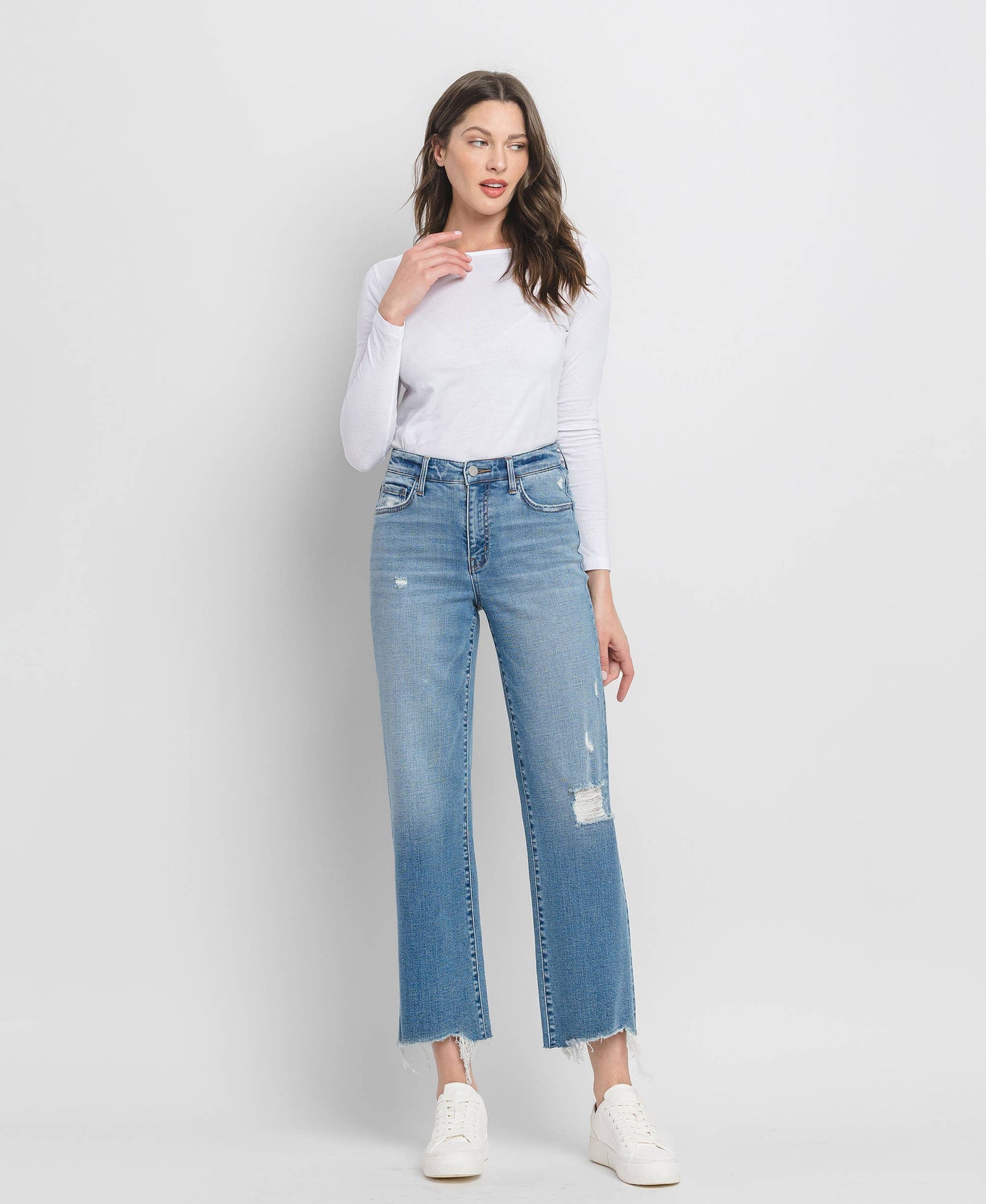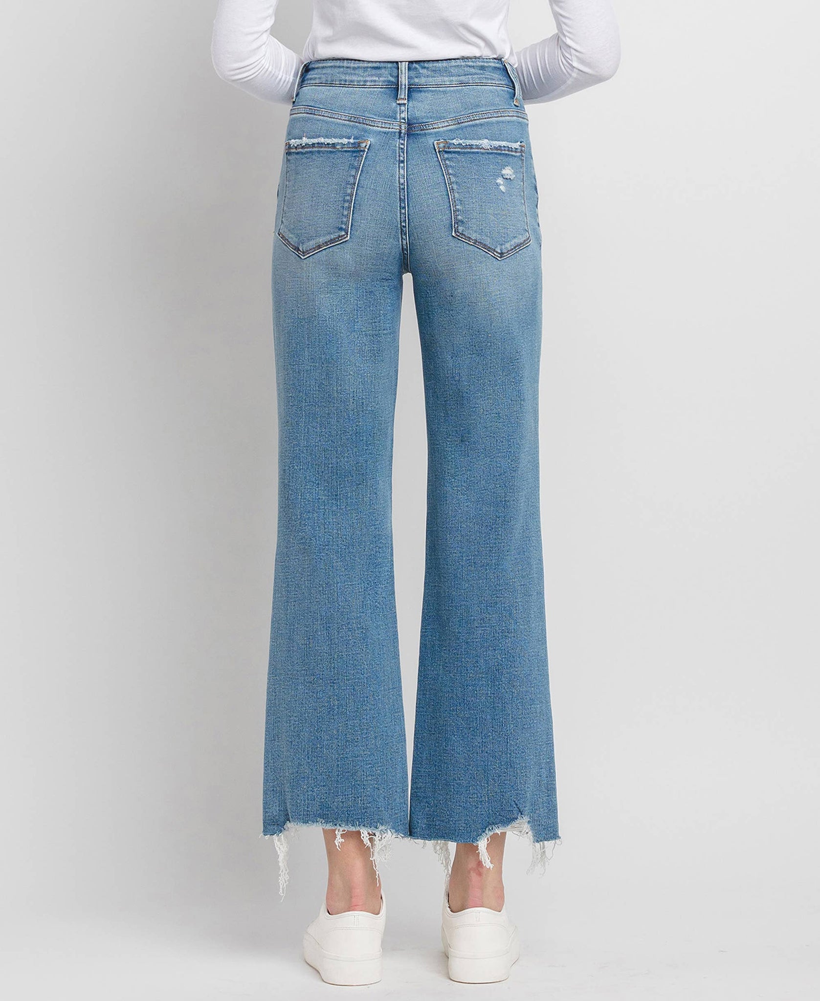 HIGH RISE WIDE LEG JEANS COMFORT STRETCH DENIM, HIGH RISE WAIST, DISTRESSED DETAIL, RAW HEM, ANKLE LENGTH, WIDE LEG JEANS F. RISE: 10" / INSEAM: 28'' / LEG OPENING: 18'' MODEL IS 5' 10'' WEARING SIZE 26