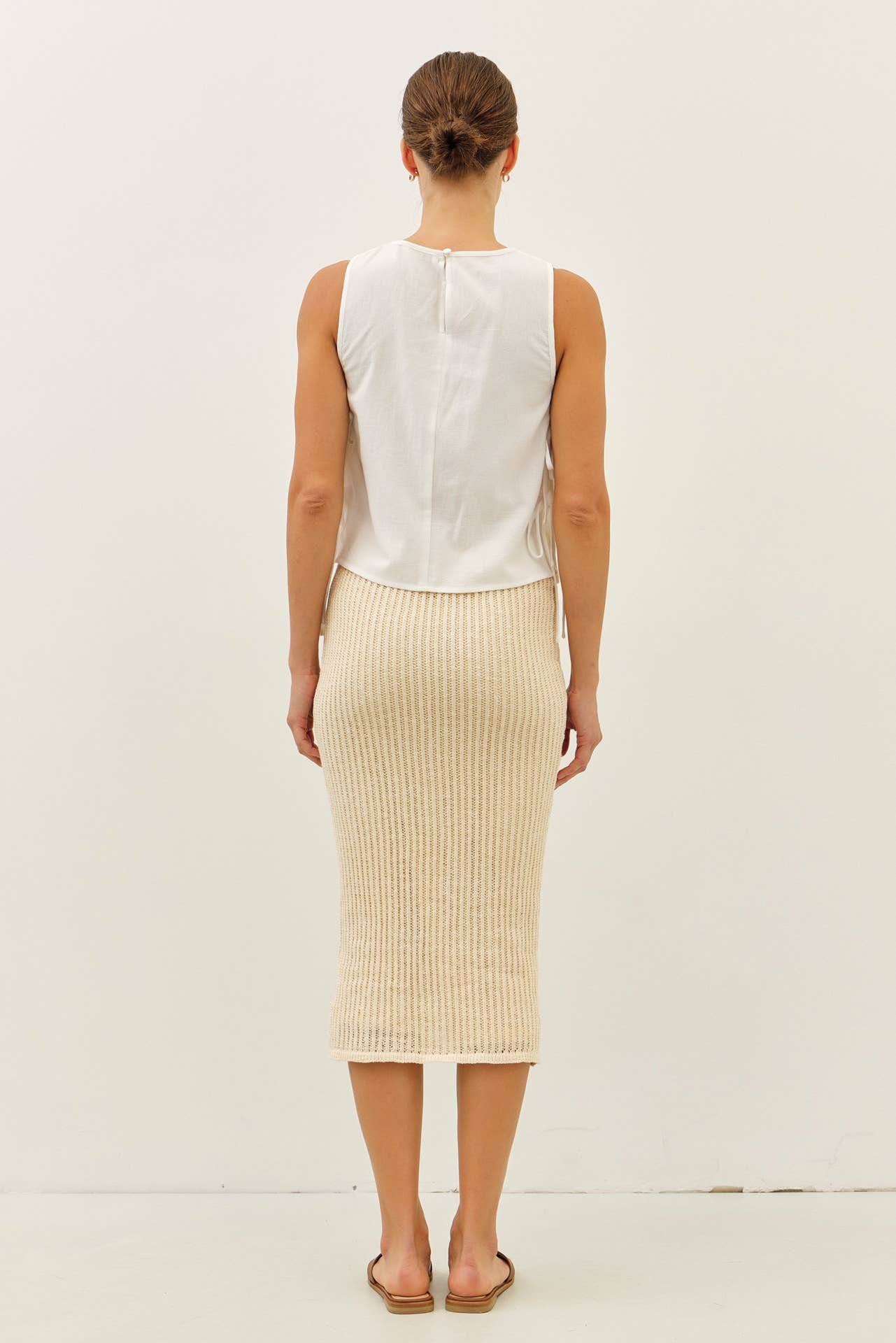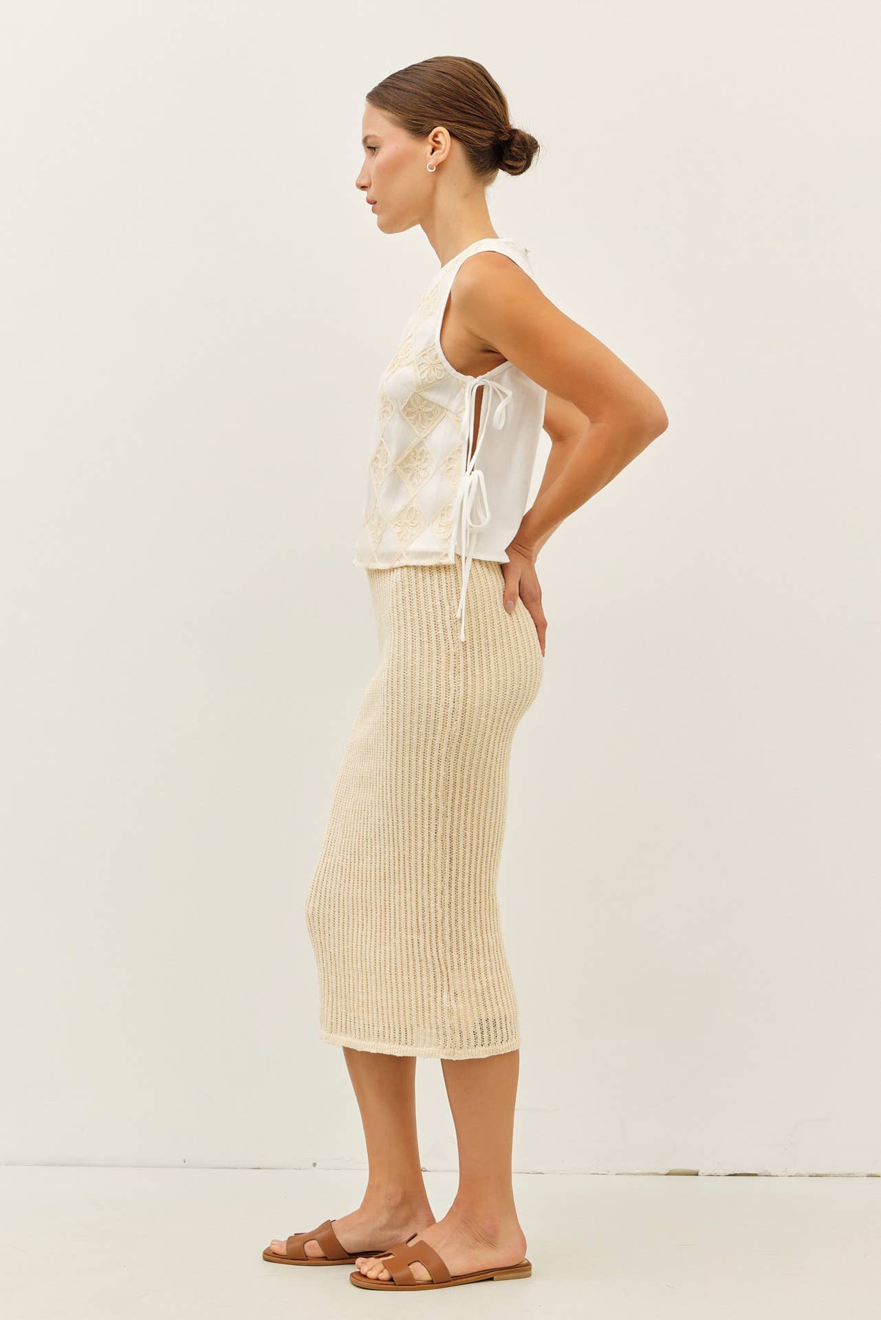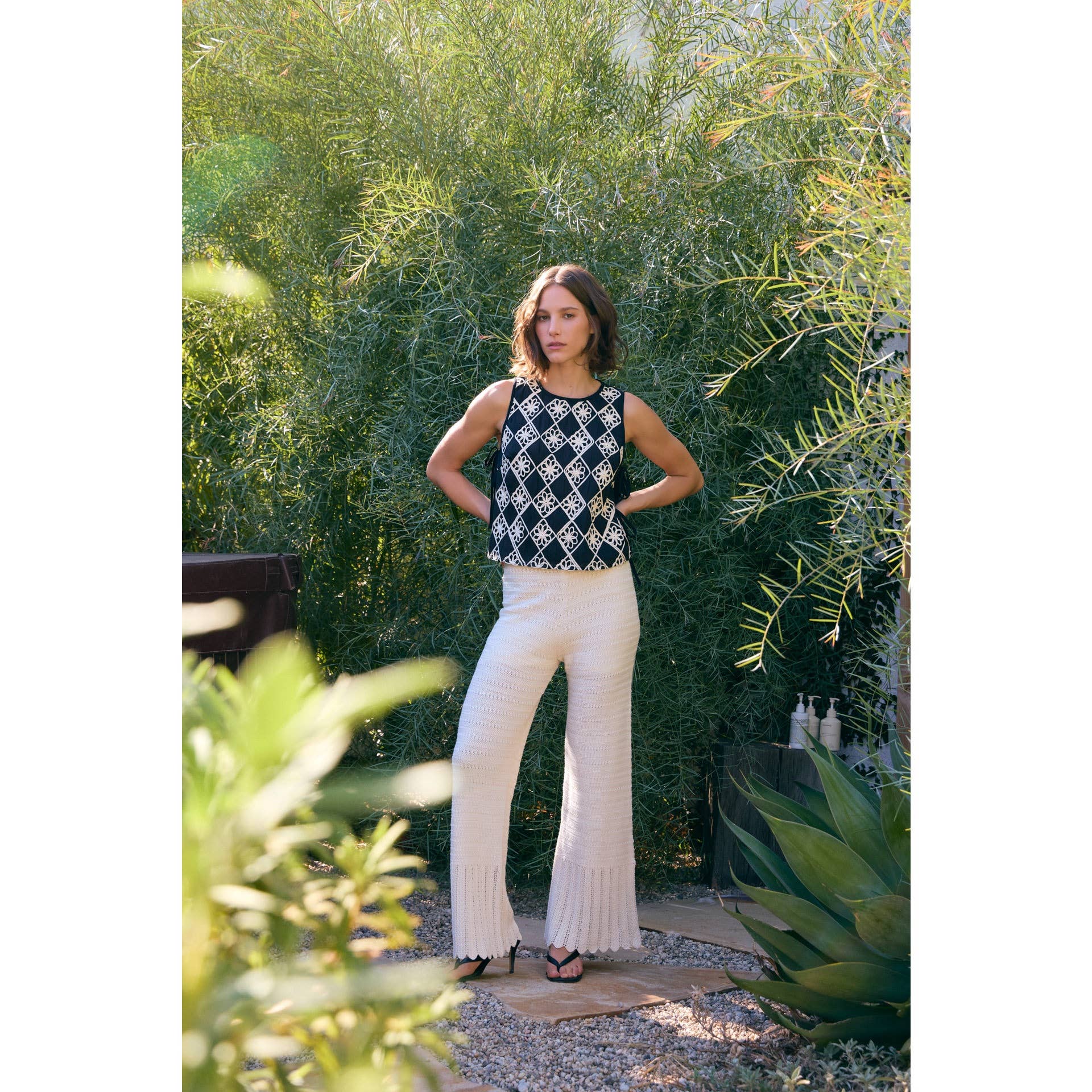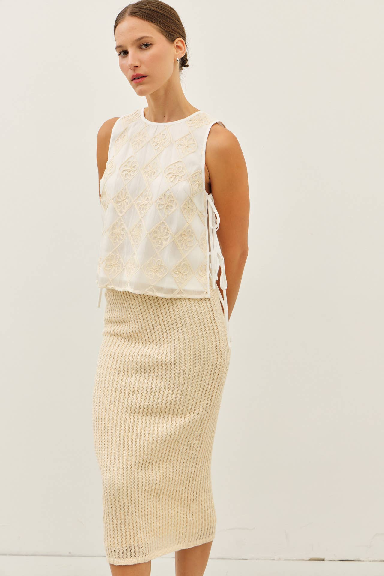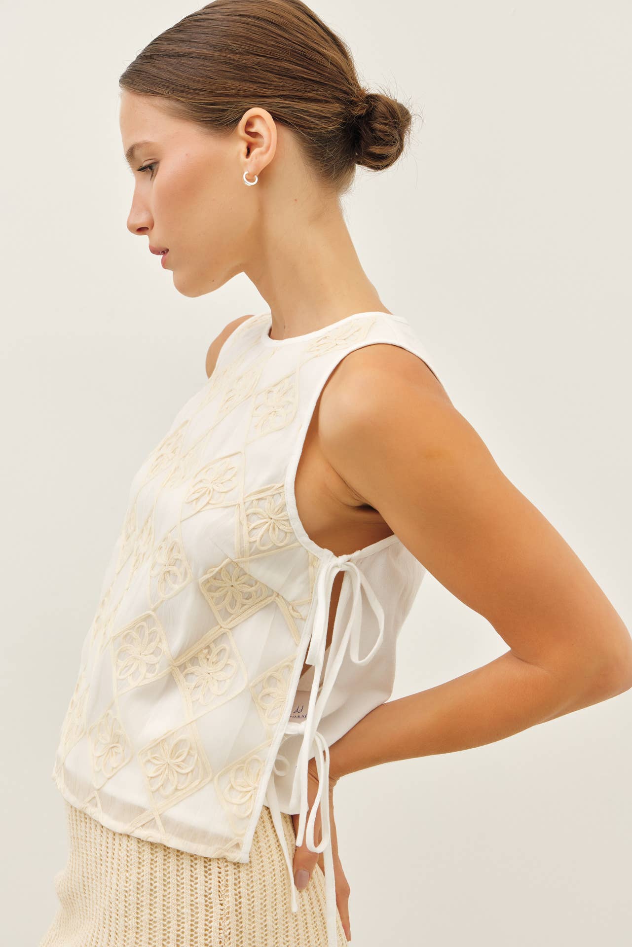 Features - Round neck - Sleeveless - Floral applique embellished - Side bow tie detail - Back keyhole - Back button closure Contents - SELF: 100% COTTON - CONTRAST: 100% POLYESTER Size + Fit Model is 5'9" and wearing a size Small Please refer to our size chart.