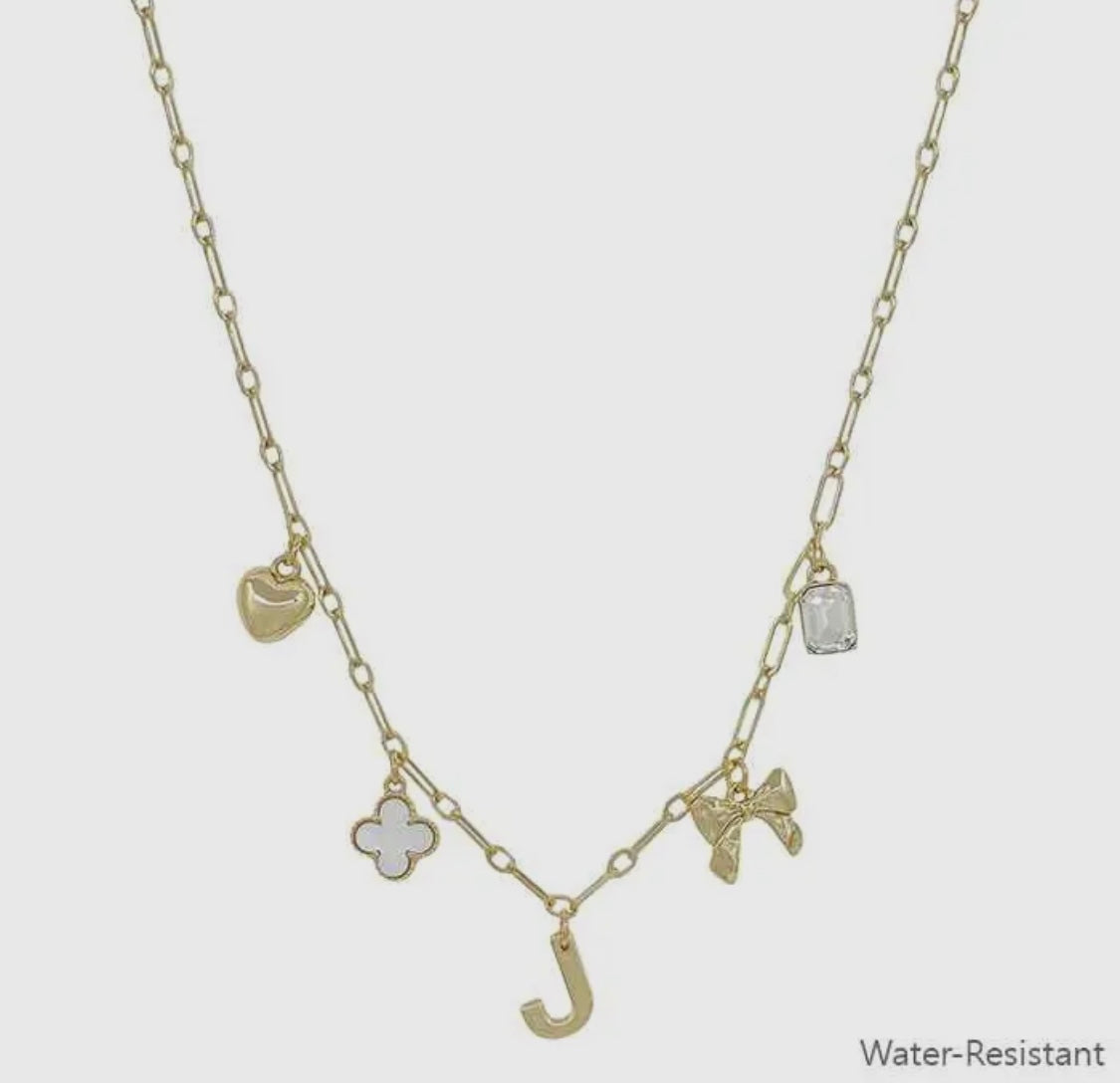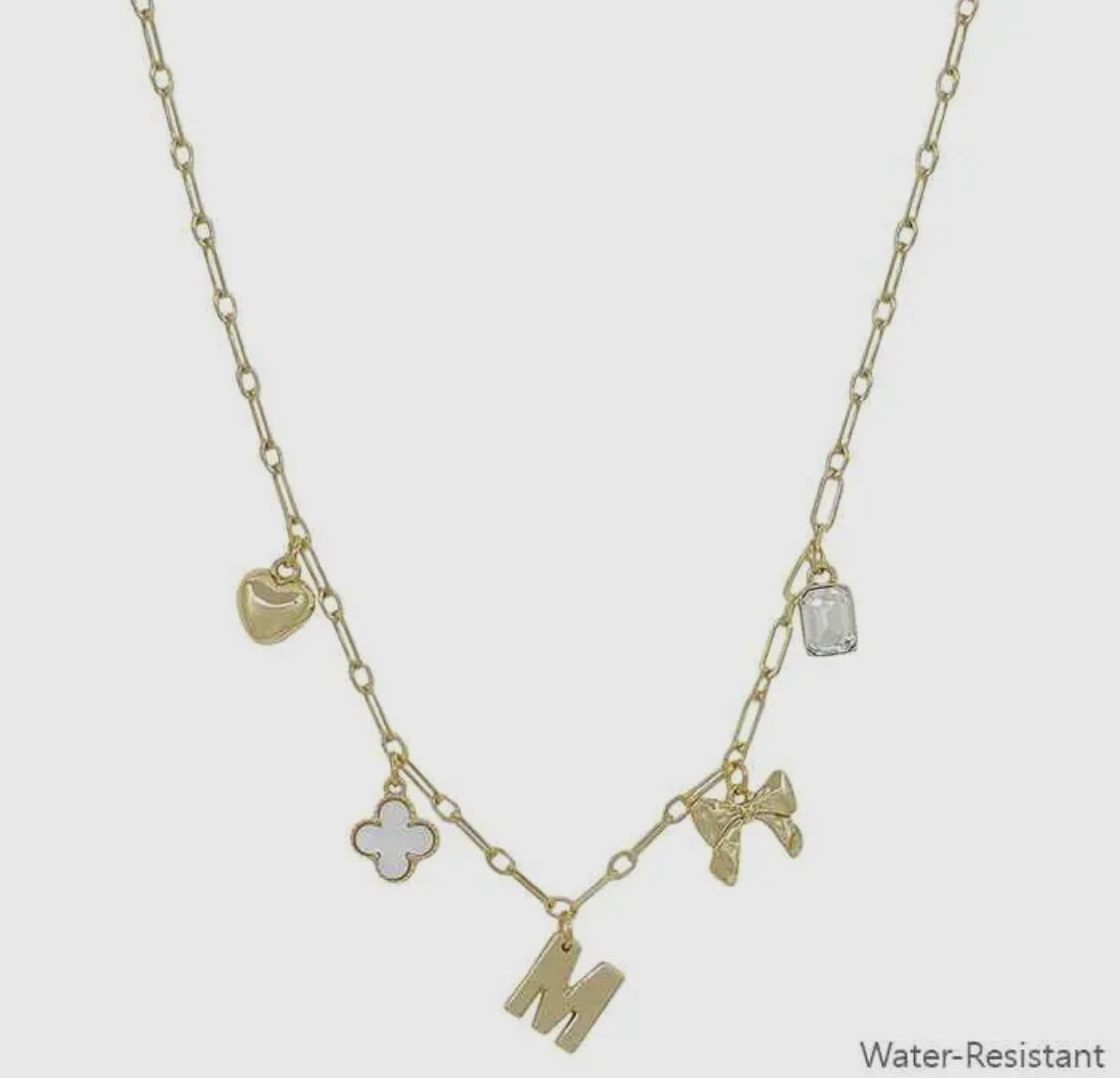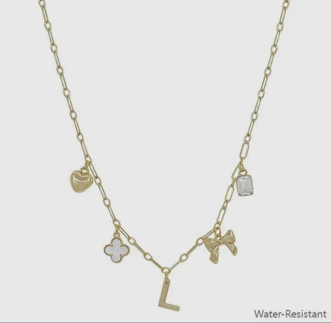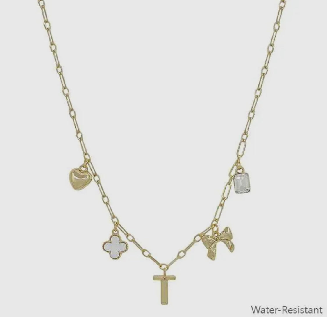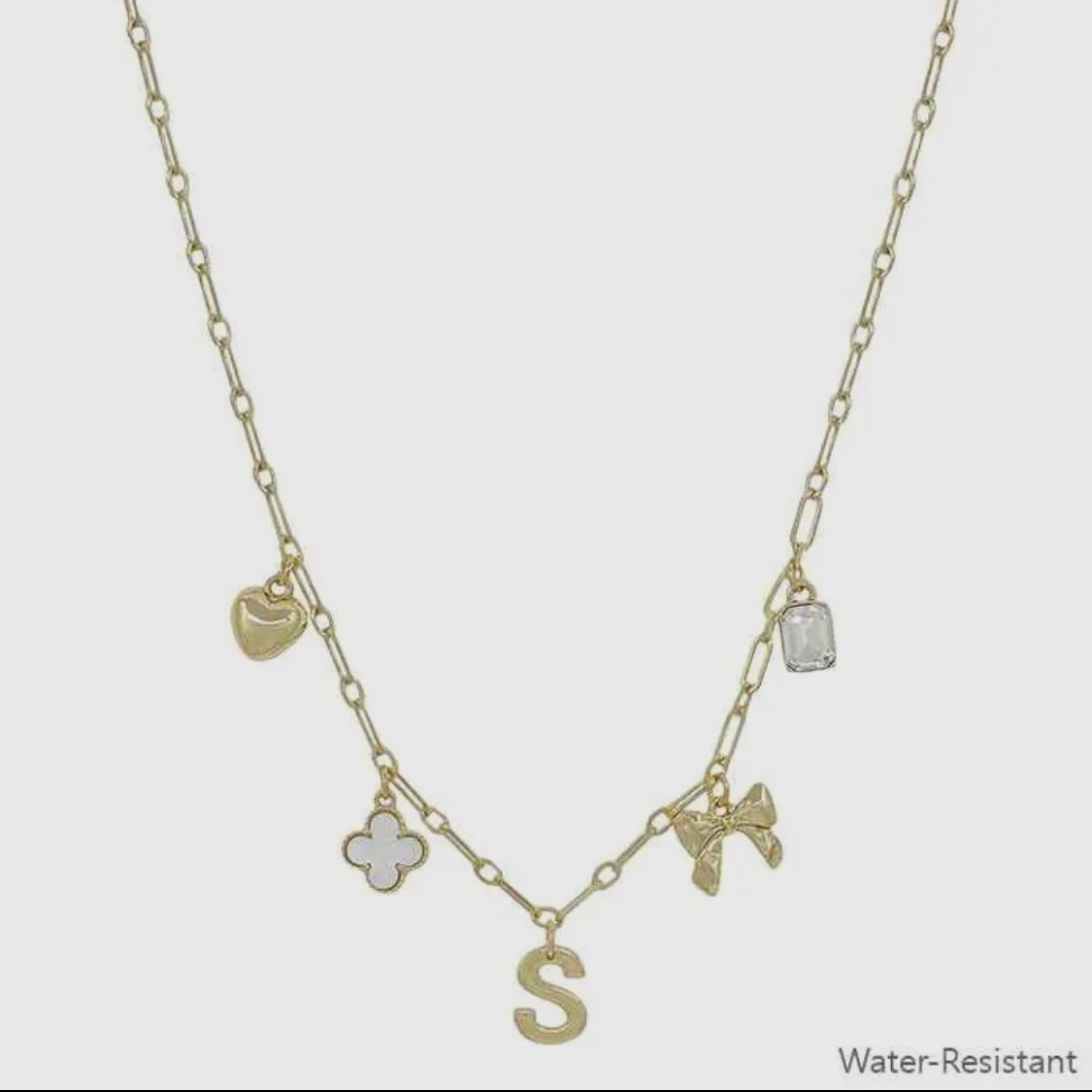 Water Resistant Gold Chain Initial Charm with Clover, Puffy Heart, Bow Necklace 16"-18" Necklace