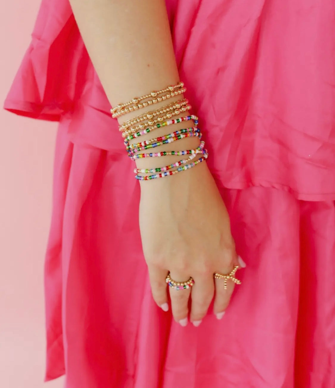 Made with 14 K gold filled tarnish proof beads and durable elastic string.