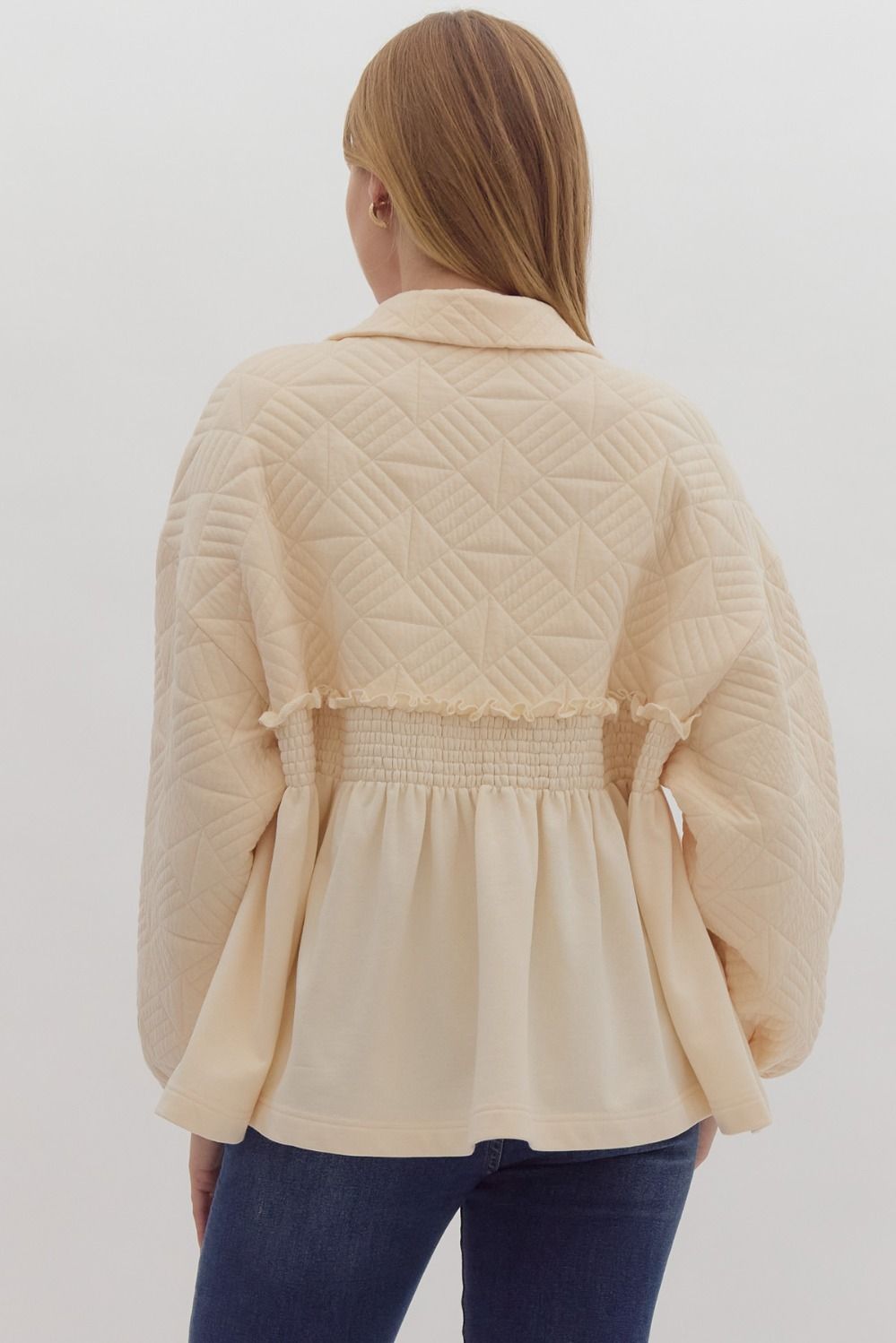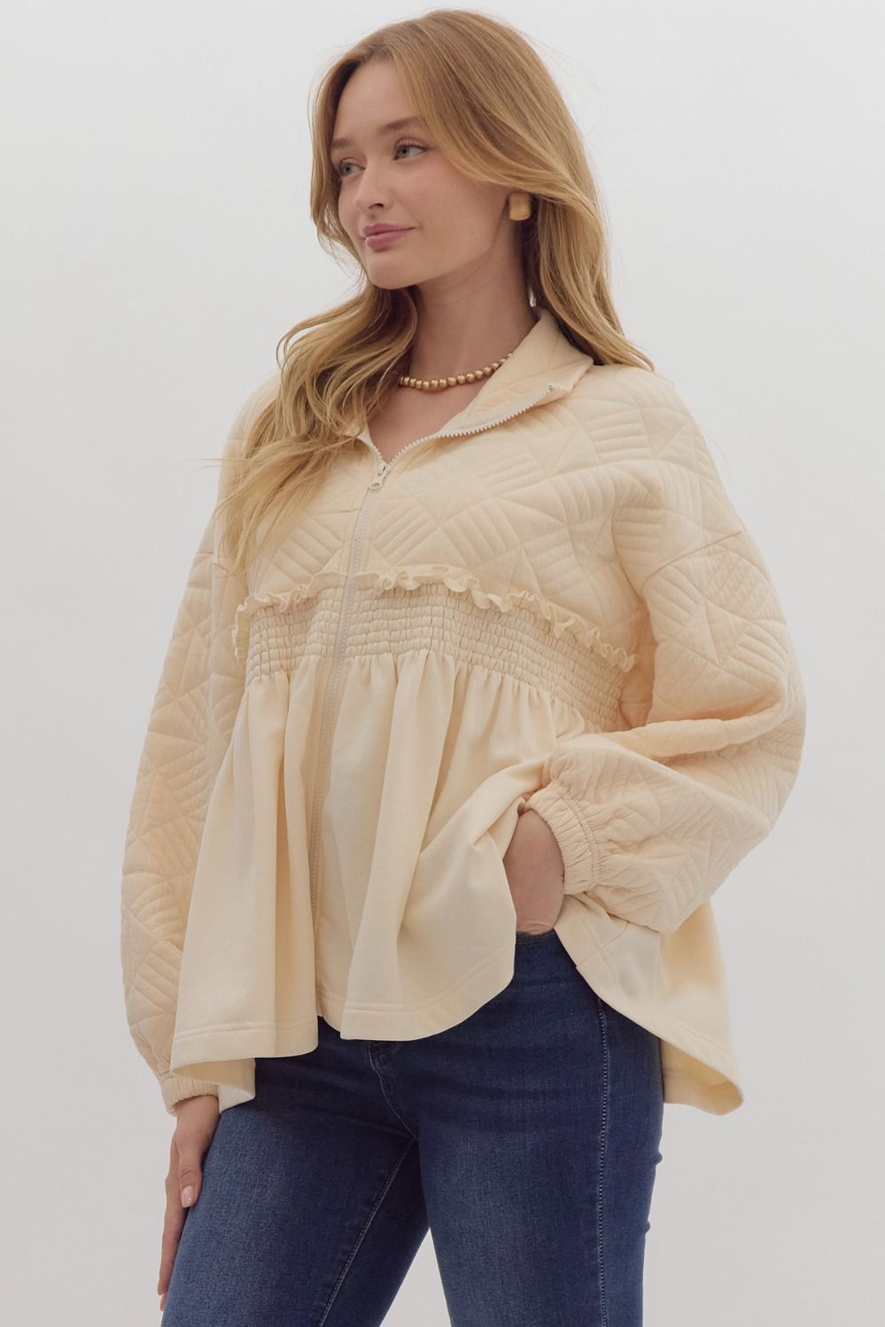 Solid textured long sleeve collared ruffled zip up jacket featuring smocked detail. Unlined. Knit. Non-sheer. Lightweight.