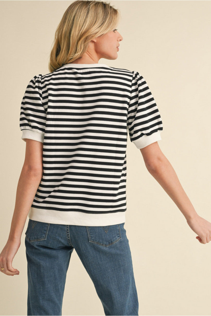Striped top with U-neck, short puffed sleeves and ribbed hems.