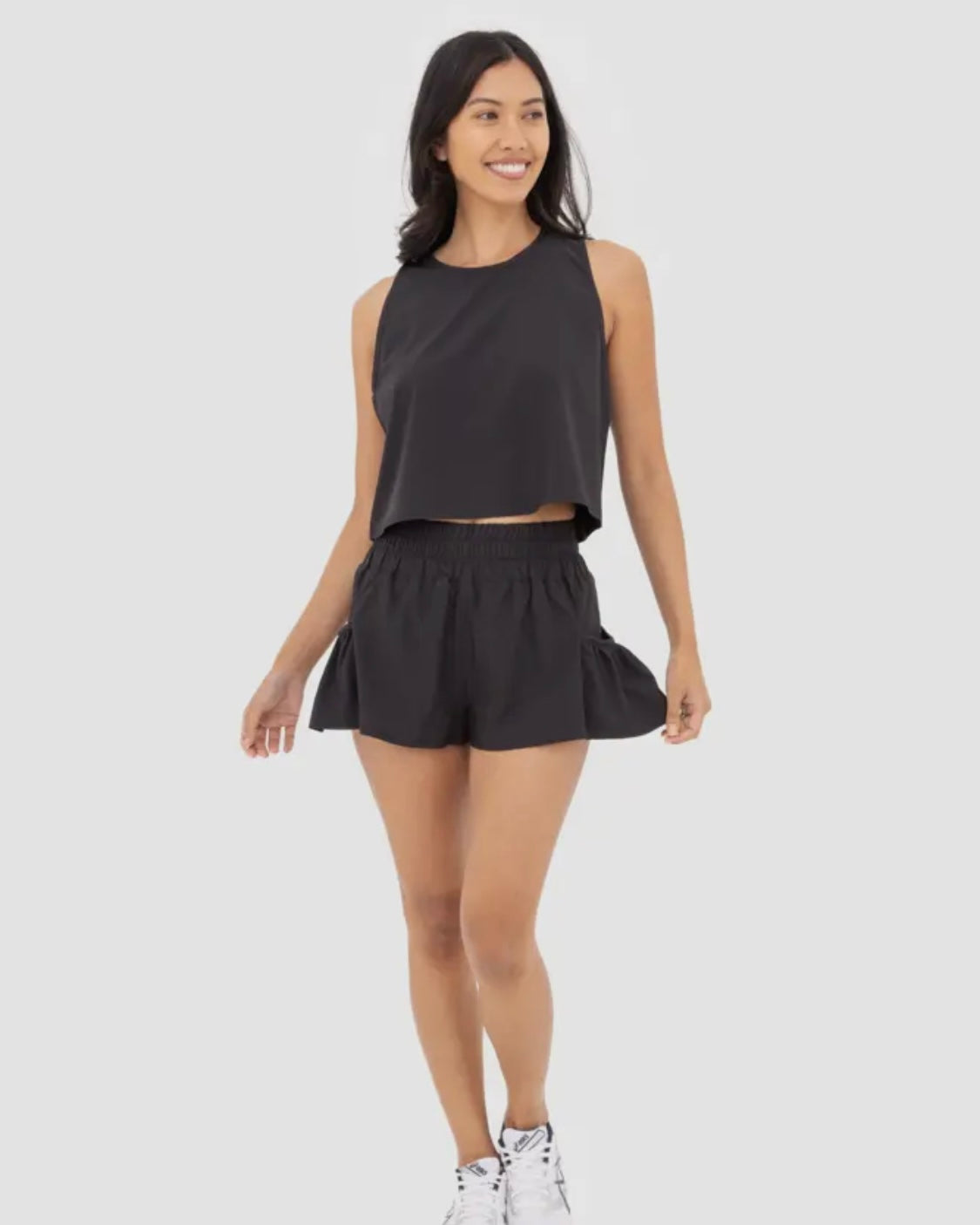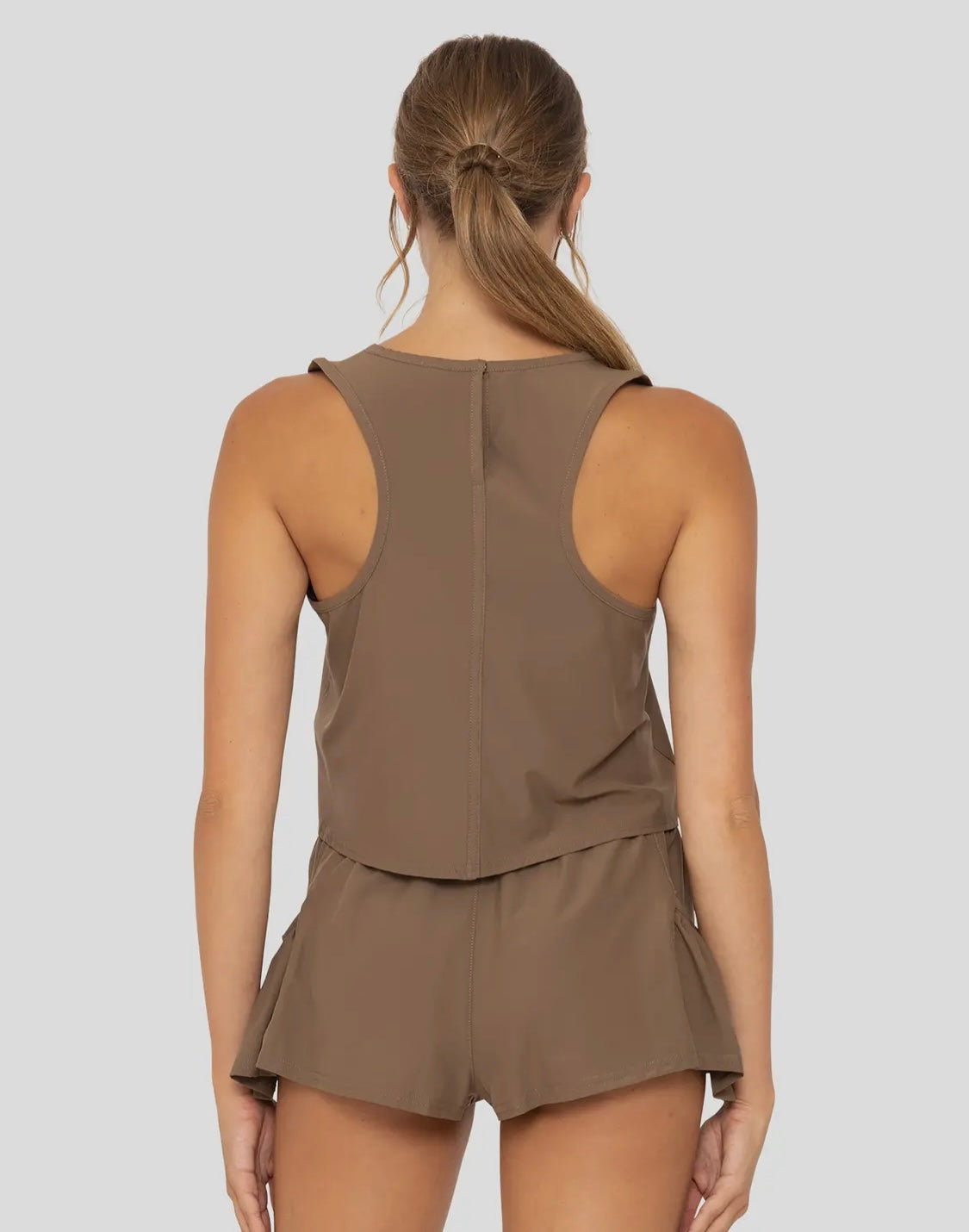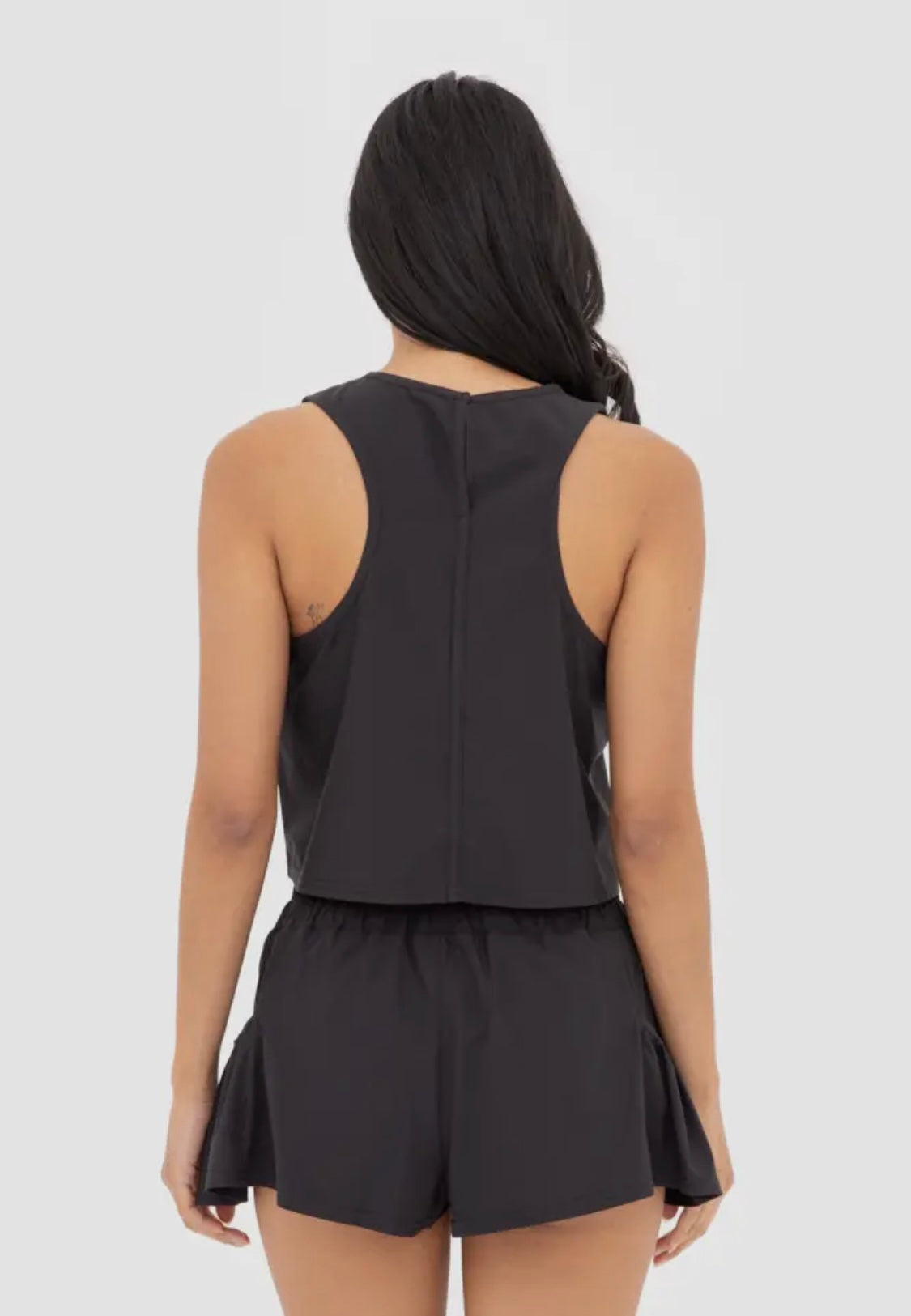 Trendy loose cropped tank top featuring a snap closure keyhole for a touch of edgy flair.