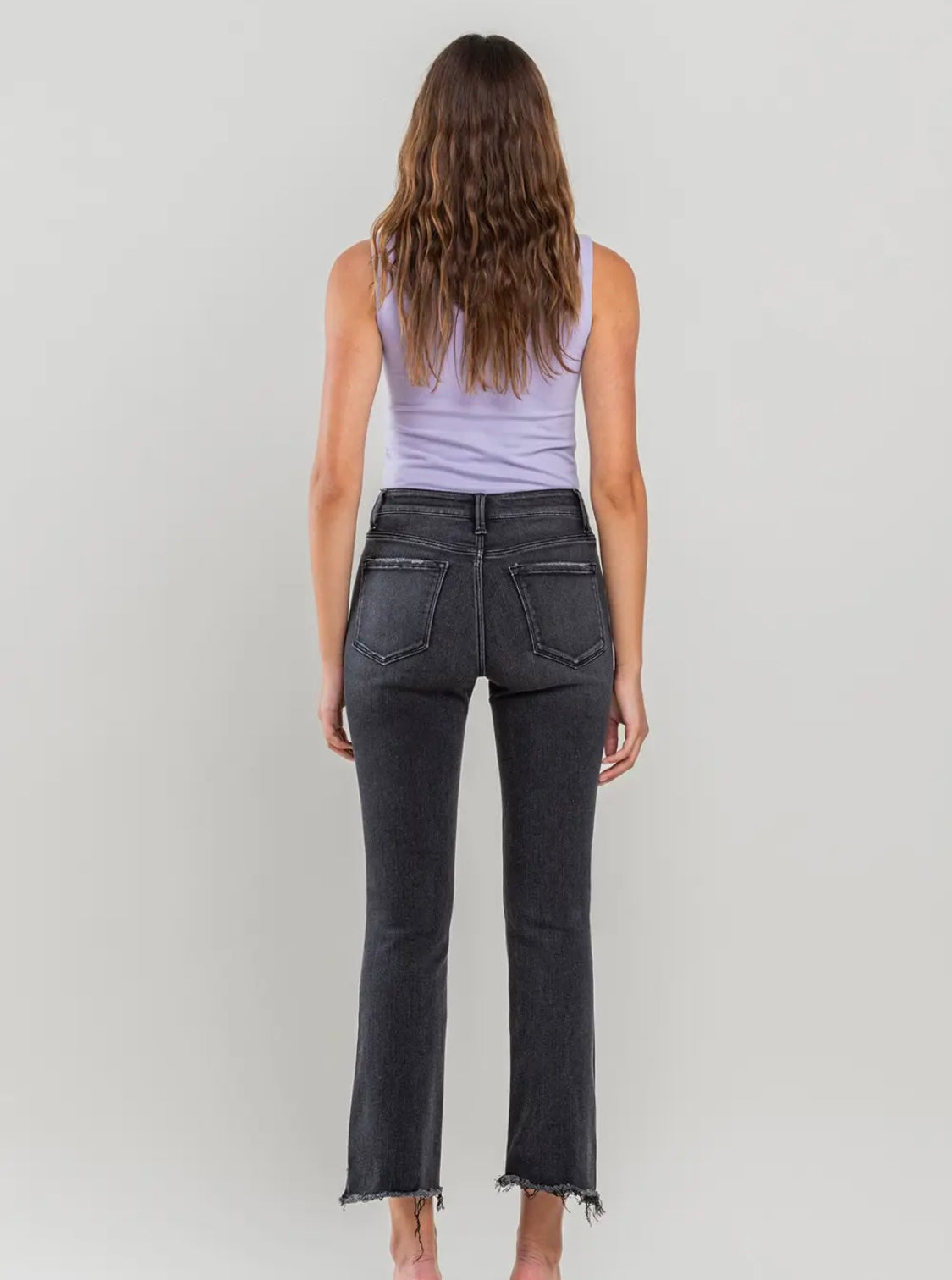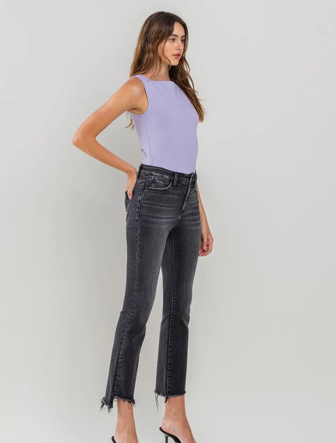 COMFORT STRETCH DENIM, HIGH RISE WAIST, RAW STEP HEM, CROPPED LENGTH, FLARE JEANS