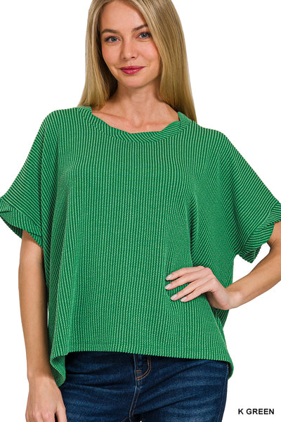 TEXTURED LINE SHORT TWISTED SLEEVE TOP- WAVY CORDED RIB KNIT