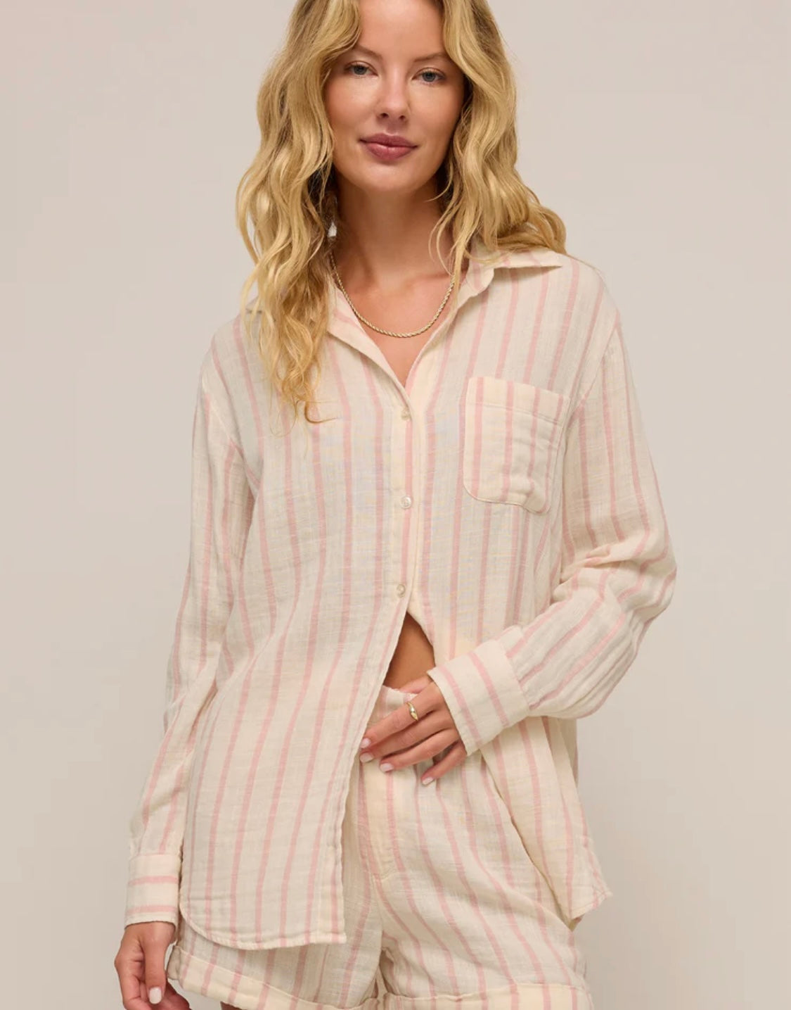 Relaxed and versatile, this striped button-up shirt is made from midweight double-layer gauze for a soft, breathable feel. With a classic collar and long sleeves, it’s the perfect layer for all your downtime moments.
